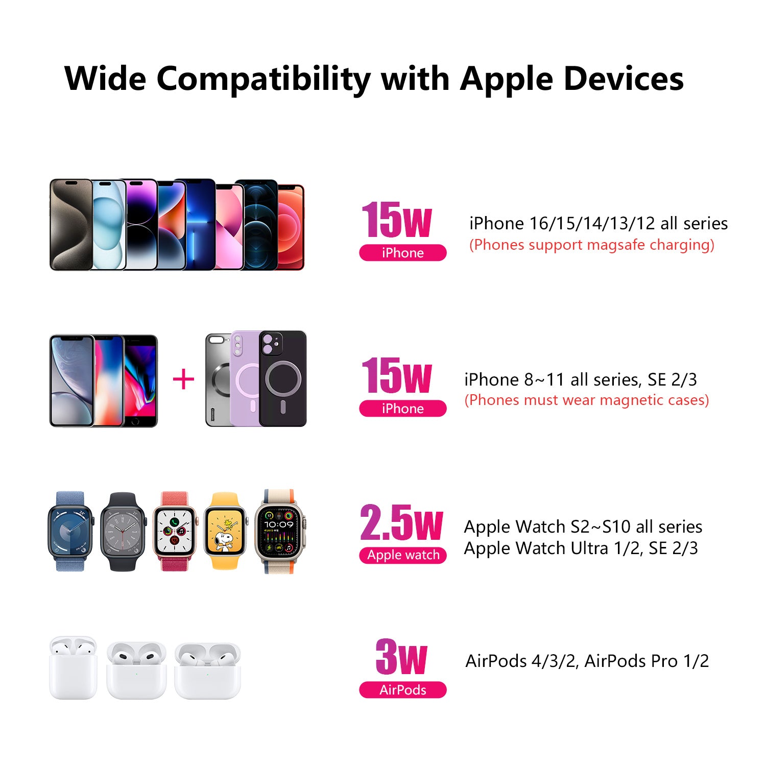 - 4-in-1 Wireless Charger : Fgelmyn charging station for Apple devices charging your iPhone, AirPods, and Apple Watch simultaneously Qi2 Certified. It’s a must-have device for Apple fans. Say goodbye to those endless cables and individual chargers. Compatible with iPhone 12-16series,Apple Watch Series 9 8 7 6 5 4 3 2 SE, AirPods 2 3 pro 2.